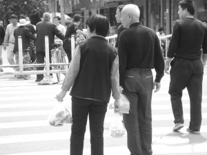 ?。翟拢保谷丈衔纾保啊茫常?,市區(qū)八一路與育新街交叉口,兩位老人購物結(jié)束,手拎塑料袋,正在等候通過馬路。
