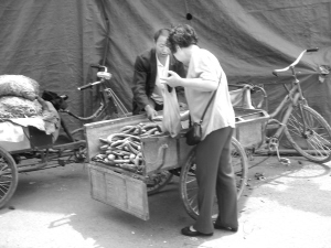5月19日上午10∶10,六一路上,一位女士拎著塑料袋,正在挑選蔬菜?!∮浾?范夢博 攝