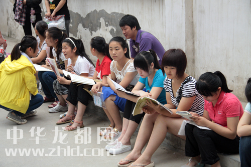 考生等待進場前許多學(xué)生突襲溫習(xí)