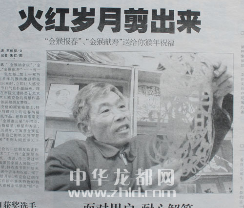 ????2003年底,周口晚報(bào)記者王俊祥在參加一個(gè)朋友的飯店開業(yè)時(shí),偶然發(fā)現(xiàn)眾多禮品中有一幅貼在玻璃上的手工剪紙作品很是吸引眼球。通過打聽,得知這是熊克儉的作品。于是,王俊祥和攝影記者朱虹一起來到熊克儉家,在喜迎猴年之際,采寫了圖文并茂的消息《火紅歲月剪出來》。