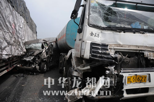 ????現(xiàn)場(chǎng),20多輛汽車(chē)駕駛室嚴(yán)重變形。一輛懸掛晉M牌照拉木材的貨車(chē)的駕駛室被撞成一團(tuán),方向盤(pán)甩在4米外的路面上。約2公里長(zhǎng)的地面上散落了不少貨物、車(chē)窗碎片及大片機(jī)油。
