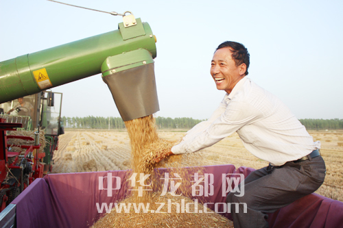 ??? ?眼看金燦燦的麥粒不斷從機倉里流出,項城市一農(nóng)民的臉上露出了燦爛的笑容。為保證夏收順利進行,項城市充分發(fā)揮大型農(nóng)業(yè)機械在麥收中的作用,爭農(nóng)時、搶速度,確保小麥顆粒歸倉?!。◤堄谰?攝)