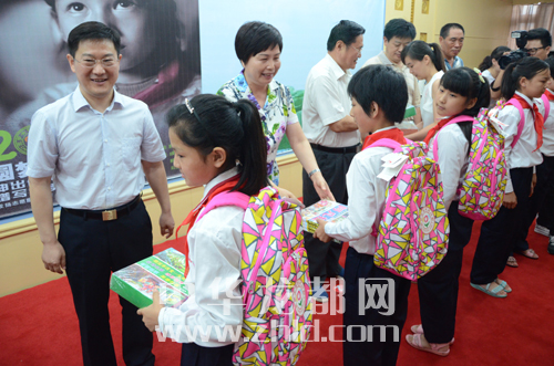 本報(bào)訊 為助力每一位貧困女孩實(shí)現(xiàn)美好的夢(mèng)想,7月13日,2015年“圓夢(mèng)女孩志愿行動(dòng)周口行”啟動(dòng)儀式在周口飯店舉行。啟動(dòng)儀式上,有關(guān)領(lǐng)導(dǎo)不僅為志愿者頒發(fā)了證書(shū),為志愿者隊(duì)伍授旗,還為太康縣圓夢(mèng)女孩代表贈(zèng)送了書(shū)包和圖書(shū)。