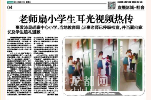 在等待調查結果的同時,記者通過網絡積極尋找與該視頻相關的信息。9月12日17時許,記者在當天的《彭城晚報》上看到一則標題為《老師扇小學生耳光視頻熱傳》的消息,報紙上刊登的圖片為視頻中的截圖。據(jù)報道,該事件發(fā)生在江蘇省徐州市沛縣胡寨中心小學。9月9日7時30許,胡寨中心小學老師吳某對沒有完成作業(yè)的3名學生進行體罰,后被人舉報。目前,涉事學校和老師已向家長和學生賠禮道歉。