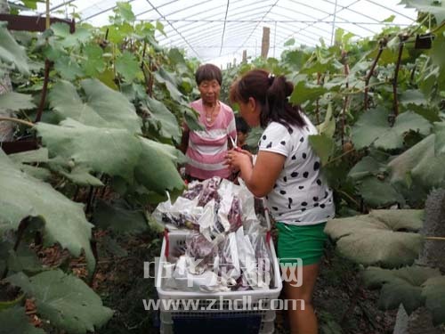 ????在農(nóng)場的葡萄大棚里,一串串葡萄被套上了塑料袋,形成了五顏六色的奇特景觀,社員正忙著采摘裝箱(如圖)。農(nóng)場技術(shù)人員介紹:“給葡萄套袋,可以明顯改善果實品質(zhì),保護果實不受病蟲害侵襲,減少農(nóng)藥殘留,防鳥啄食,改善果實外觀,提高果品檔次,是當前生產(chǎn)高品質(zhì)、無公害葡萄的有效措施?!?/p>