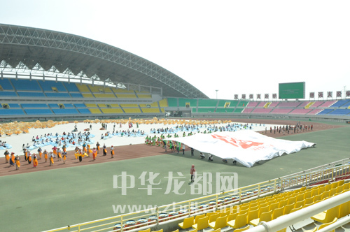 參加我市第三屆運(yùn)動(dòng)會開幕式的演職人員在體育場彩排