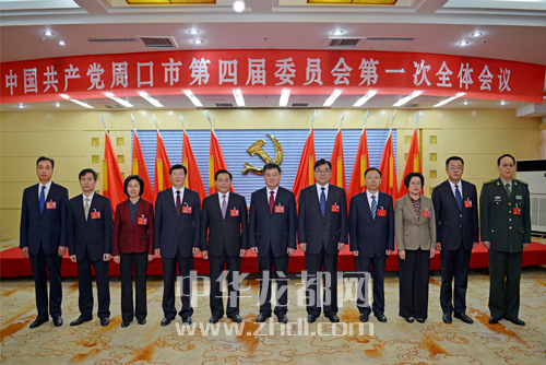 ????下圖:新當選的中共周口市第四屆委員會常務委員會委員徐光(左六)、劉繼標(右五)、李德才(左五)、劉保倉(右四)、王富興(左四)、方婷(右三)、牛越麗(左三)、李云(右二)、擺向陽(左二)、元相學(右一)、朱良才(左一)。記者 王映 攝