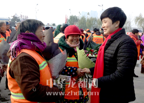 ????昨日上午,淮陽(yáng)縣總工會(huì)廣場(chǎng)熱鬧非凡,愛(ài)心人士陳慧女士(右)向環(huán)衛(wèi)工人捐贈(zèng)了700套保暖用品。