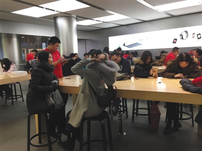 ????12月11日,蘋果王府井直營店售后服務(wù)等待區(qū)。 實習生 孫亞慧 攝