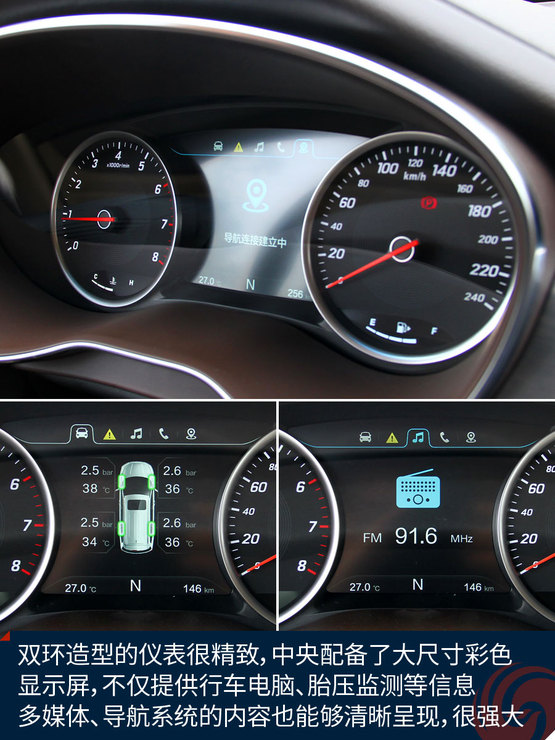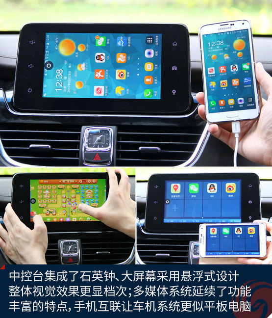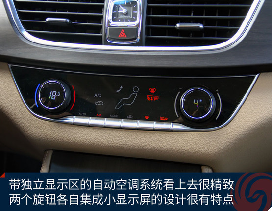 中控臺中央的大尺寸液晶屏顯示效果挺贊,高清屏、亮度高、色彩艷麗,功能上也足夠強大,收音機、藍牙免提、影音播放、GPS導航等等非常全面,前后雷達、360全景影像也能夠在這里清晰顯示,只可惜手機互聯(lián)僅支持安卓系統(tǒng),希望日后能有所完善。下方的自動空調(diào)控制區(qū)很精致,也很顯檔次。