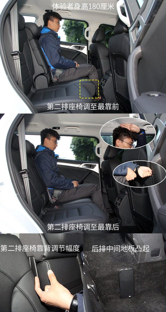 關(guān)于第二排,最重要的當(dāng)然要數(shù)空間了。剛一坐到第二排之后,感覺確實(shí)是很寬敞,不僅腿部空間毫無(wú)壓力,頭部空間也完全沒(méi)有壓抑感,而且,第二排座椅還支持四向調(diào)節(jié),即座椅前后調(diào)節(jié)和靠背角度調(diào)節(jié),在第三排沒(méi)人乘坐的情況下,第二排乘客基本可以找到N種舒服姿勢(shì)來(lái)應(yīng)對(duì)長(zhǎng)途乘坐。只不過(guò),第二排的中間地板凸起較高,一定程度上影響了中間乘客乘坐的舒適度。