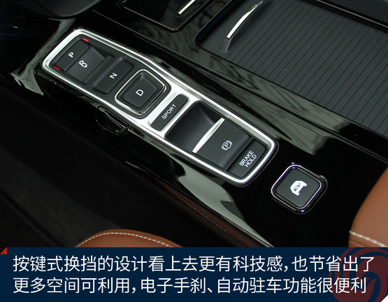 車內采用了新的棕色真皮內飾,而且還覺得缺了點什么。沒錯!之前的排擋桿不見了,取而代之的是按鍵式換擋機構,看上去更有科技感,控制區(qū)也更簡潔了。
