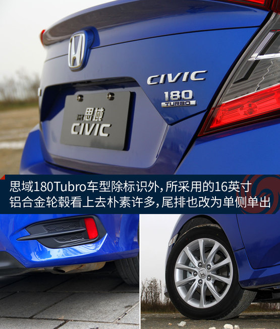 隨著思鉑?;靹榆囆偷耐瞥觯@次走入門路線的思域1.0T也來打了個醬油。跟之前的1.5T車型相比,外形基本保持一致。鑒于其更入門的定位,輪轂的樣式看起來沒那么精致和動感了,尾排改為了單側單出的設計,車尾的動力標識也有之前的“220TURBO”改為“180TURBO”。
