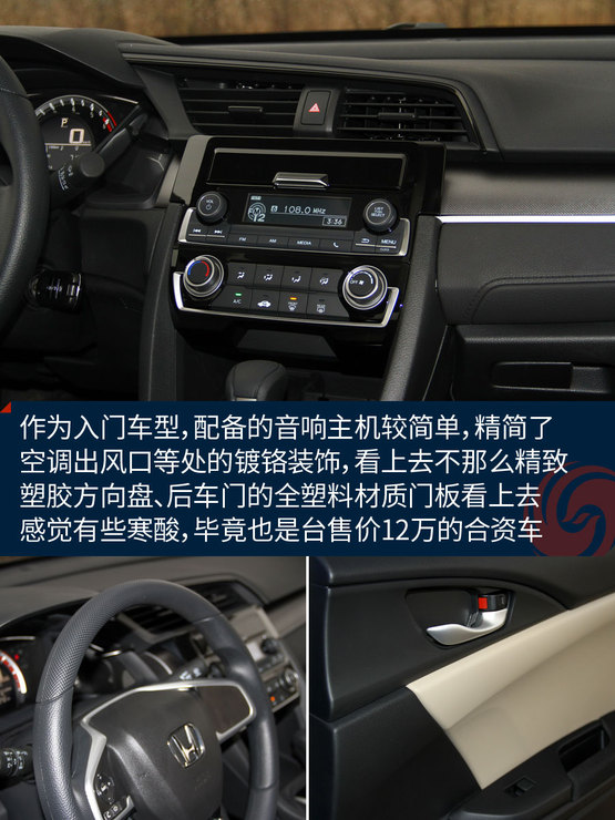 十代思域的內飾精干又很有層次感,1.0T車型只是在用料上簡化了些,空調出風口等處去掉了鍍鉻裝飾,看起來有點素。帶大屏幕的娛樂系統(tǒng)自然不會保留,換上的音響主機聽音樂、藍牙免提這些基本功能還是齊備的,不過車內音響系統(tǒng)就只有兩個前門上各有一個的喇叭了。