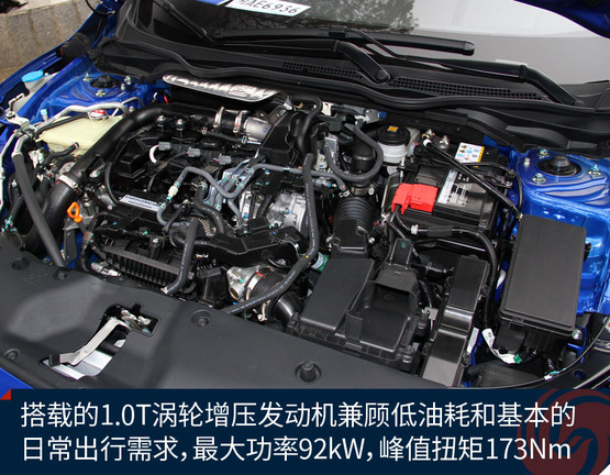 思域180TURBO車型搭載的是1.0升三缸渦輪增壓發(fā)動機,賬面上擁有的最大功率為92kW/5500rpm,最大扭矩達到了173Nm/2000-4500rpm,基本能夠達到主流1.8升自吸發(fā)動機的水平。與之匹配的CVT無級變速器大家都比較熟悉,在本田品牌的車型中已經有著廣泛的應用。