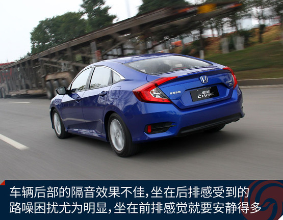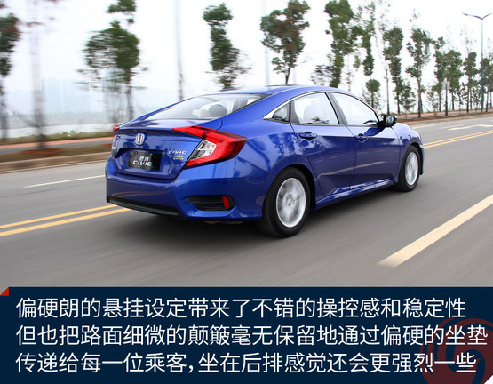 思域的定位一直偏向運動,這一代車型自然不會放棄這一特色,底盤的扎實感、懸掛偏硬朗的設定都營造了同級別里相對出色的操控感受。不過懸掛系統(tǒng)在韌性方面相對薄弱,路感太強烈,鋪裝路面上細微的不平整所帶來的振動也比較清晰地傳遞到車內。座椅的靠背包裹感還不錯,填充也比較得體,很舒服,但坐墊偏硬,因此行駛中車輛整體對振動的抑制能力欠佳,很大程度上影響了舒適性。