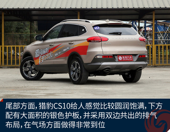 側(cè)面看過去,獵豹CS10采用一條剛勁十足的腰線從頭燈到尾燈,展現(xiàn)出了蓄勢待發(fā)的車身姿態(tài),同時鍍鉻窗框亮條的使用讓該車看上去更加豪華大氣。尾部方面,獵豹CS10給人感覺比較圓潤飽滿,下方配有大面積的銀色護(hù)板,并采用雙邊共出的排氣布局,在氣場方面做得非常到位。