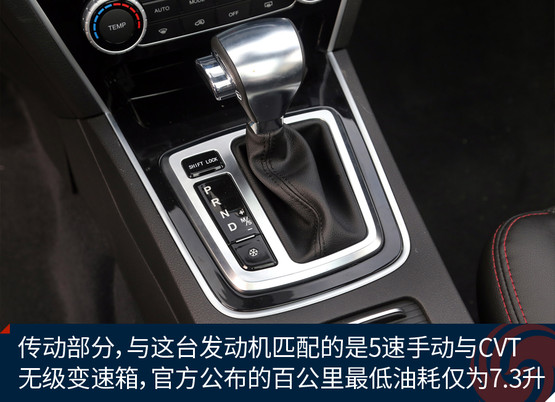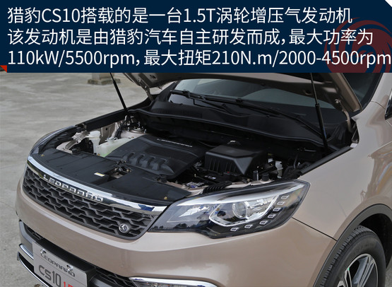 本次我們試駕的獵豹CS10搭載了一臺1.5T渦輪增壓氣發(fā)動機(jī),最大功率為110kW/5500rpm,最大扭矩為210N.m/2000-4500rpm。傳動部分,與這臺發(fā)動機(jī)匹配的是5速手動與CVT無級變速箱,并采用前置前驅(qū)的驅(qū)動形式。