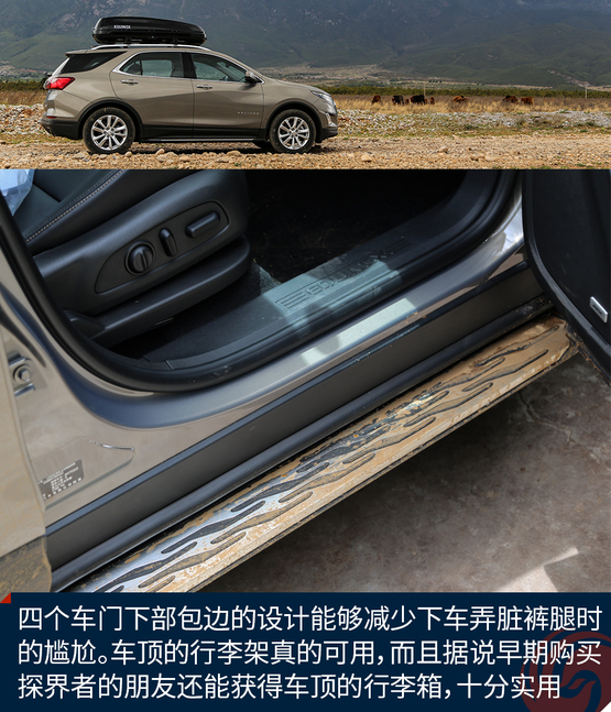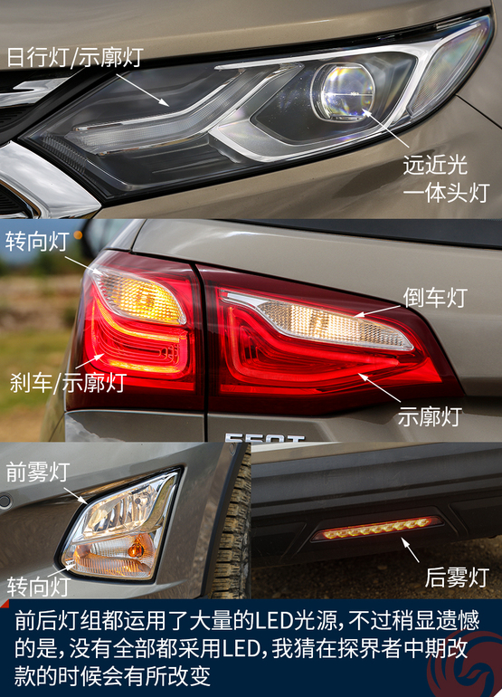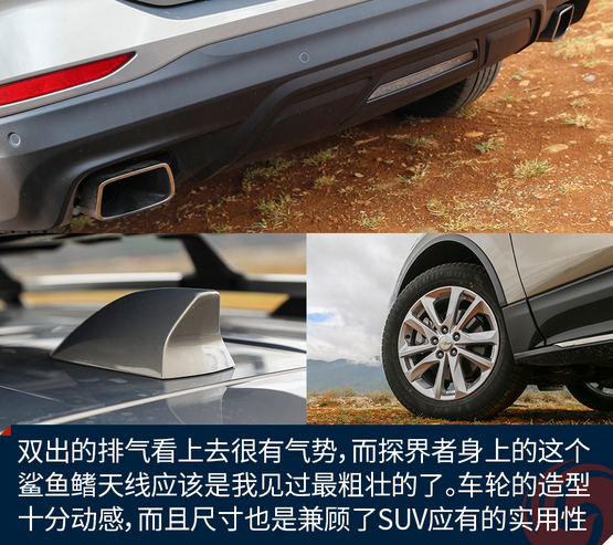 外觀上令我印象深刻的地方有這么幾個,首先前后燈組都運用了大量的LED光源,不過稍顯遺憾的是,沒有全部都采用LED,我猜在探界者中期改款的時候會有所改變。四個車門下部包邊的設(shè)計能夠減少下車弄臟褲腿時的尷尬。車頂?shù)男欣罴苷娴目捎?,而且?jù)說早期購買探界者的朋友還能獲得車頂?shù)男欣钕?,十分實用。雙出的排氣看上去很有氣勢,而探界者身上的這個鯊魚鰭天線應(yīng)該是我見過最粗壯的了。車輪的造型十分動感,而且尺寸也是兼顧了SUV應(yīng)有的實用性。