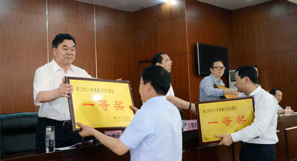 市領(lǐng)導(dǎo)劉繼標、丁福浩等為先進單位頒獎。記者 王映 攝