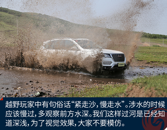 ????????涉水測試對于新哈弗H8來說簡直是小菜一碟,190mm的離地間隙,500mm的最大涉水高度,這條小河完全阻擋不了H8的腳步。俗話說“緊走沙,慢走水”是對于路況不清楚的水域,萬一進(jìn)氣系統(tǒng)進(jìn)水,發(fā)動機(jī)就會熄火。所以一定要小心涉水深度。像我們這么莽撞的壓水花,是在水域已經(jīng)探明的情況下。