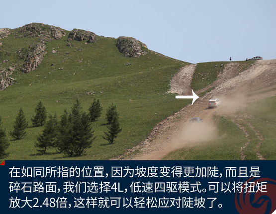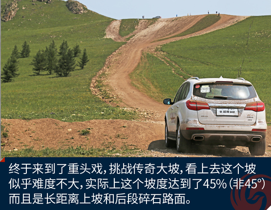 ????????經(jīng)過刺激的涉水越野,我們終于來到了此行最難的挑戰(zhàn)地,傳奇大坡。這條上山的土路從圖片上看起來不陡,實(shí)際上已經(jīng)達(dá)到了45%的坡度。人爬起來都?xì)獯跤?。而且難度大的原因是兩點(diǎn),一個是超長距離的大上坡,另一個是后端是碎石路面。你想靠沖坡根本行不通,如果動力不足最終是無法登頂?shù)?。H8不僅動力充沛而且有4L,低速四驅(qū)模式,而且博格華納雙速TOD可以隨時分配動力傳遞到前后軸,保障了有抓地力的輪胎有驅(qū)動力。