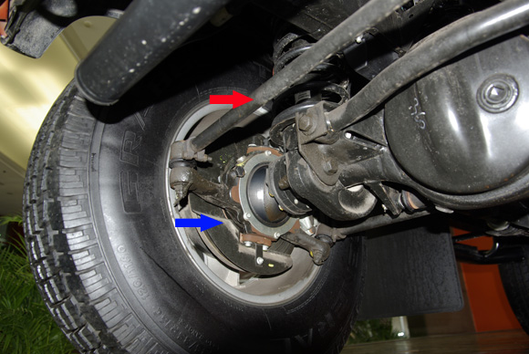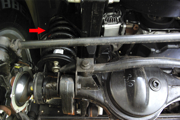 ????后軸特寫圖二,藍色箭頭所指為拖臂,紅色箭頭所指為后防傾桿,對于衛(wèi)士的車重而已,其粗細不能提供很好的仿側(cè)傾效果。后軸依然采用螺旋彈簧作為彈性元件。
