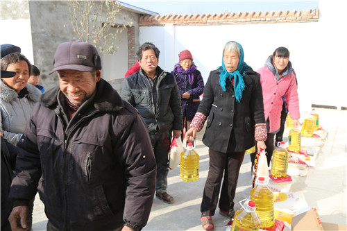 當(dāng)日上午,雖然天氣寒冷,可葉莊行政村村室院里卻暖意融融。該村村主任熊茂禮正在把備好的年貨發(fā)放到49戶村民的手中?!胺浅8兄x茂禮這么遠回老家看望我們這些困難戶,讓我們過上一個好年。”現(xiàn)年76歲的村民張多朗是個五保戶,接過熊茂禮送上的年貨連聲道謝。熊茂禮鼓勵困難戶一定要對生活充滿信心,樂觀地面對生活。同時,希望困難戶要保持良好心態(tài),積極面對困難,自強自立,早日擺脫困境。
