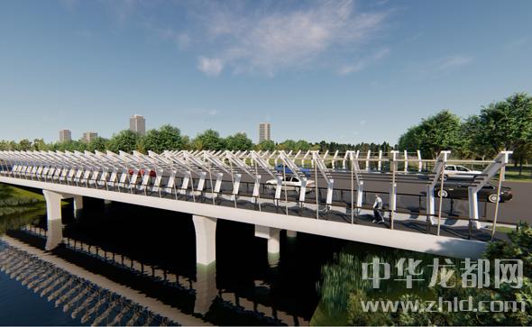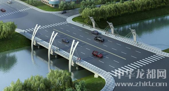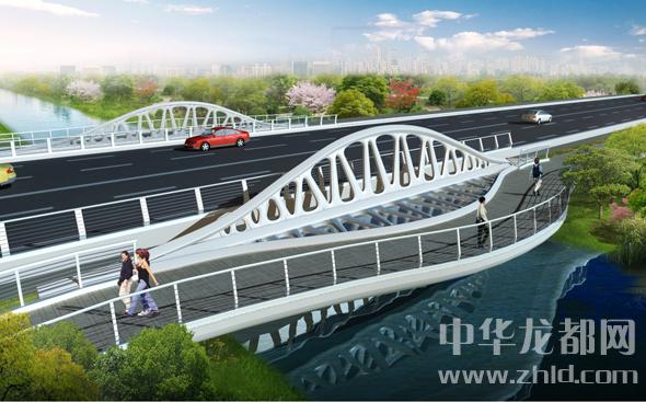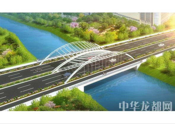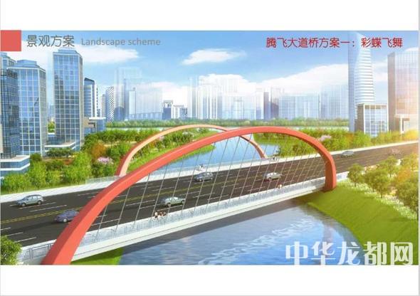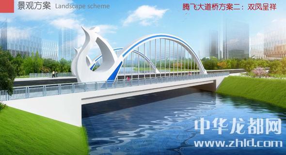 騰飛大道橋的設(shè)計方案有兩套,分別為“彩蝶飛舞”和“雙鳳呈祥”?!安实w舞”為下承式鋼管拱橋,寬36米。記者從效果圖中看到,橋兩側(cè)的拱圈,極具色彩感,給人一種賞心悅目的感覺。“雙鳳呈祥”為裝飾鋼管拱橋,寬36米。該橋采用“雙鳳”造型,象征天下太平,富含吉祥之意。