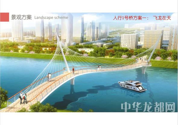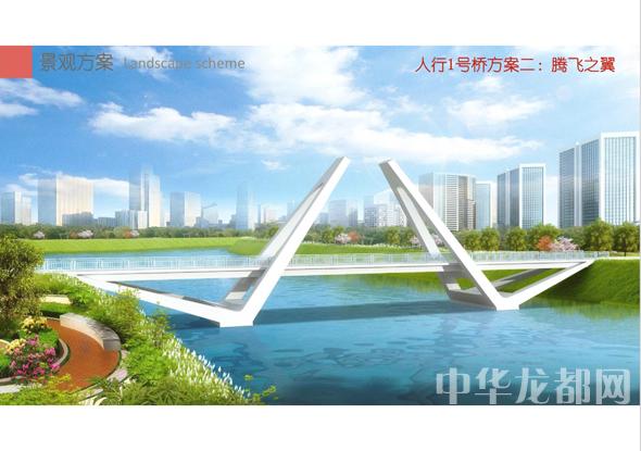 人行1號橋的設(shè)計方案有兩套,分別為“飛龍在天”和“騰飛之翼”。“飛龍在天”為雙塔斜拉橋。記者從效果圖中看到,該橋呈現(xiàn)出優(yōu)美的線條,宛如一條長龍騰空在天?!膀v飛之翼”為V腿連續(xù)鋼箱梁橋。記者從效果圖中看到,橋體簡潔流暢,時尚現(xiàn)代,橋墩形成穩(wěn)固的三角形,像兩只燕子展翅高飛。