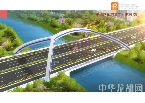 泰山路橋的設(shè)計方案有兩套,分別為“錚錚鐵骨”和“梳云掠月”?!板P錚鐵骨”為下承式系桿拱橋。記者從效果圖中看到,其拱體骨架給人一種力量感,拱身視線通透,簡潔明快。“梳云掠月”為鋼筋混凝土提籃拱橋。記者從效果圖中看到,該橋的拱圈造型獨特,簡潔又不失大氣。