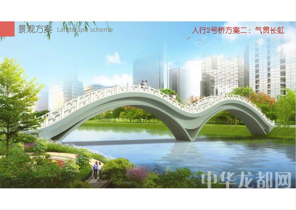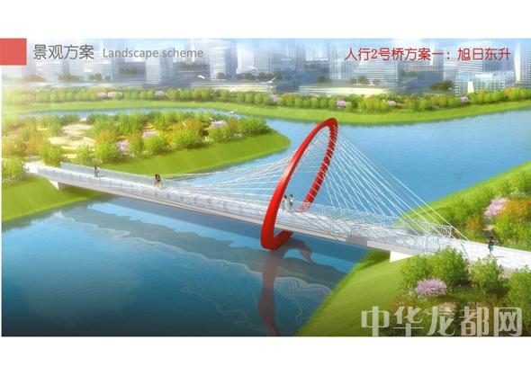 人行2號橋的設(shè)計方案有兩套,分別為“旭日東升”和“氣貫長虹”?!靶袢諙|升”為圓形塔懸索橋。記者從效果圖中看到,該橋的橋塔為圓形,猶如一輪東升的太陽,象征著城鄉(xiāng)一體化示范區(qū)蓬勃發(fā)展的未來?!皻庳為L虹”為中承式系桿拱橋。該方案結(jié)合中國玉帶橋的古典元素、抽象古典幾何美學,采用現(xiàn)代的設(shè)計手法,創(chuàng)作出現(xiàn)代感和中國傳統(tǒng)橋梁元素雜糅的橋梁設(shè)計。