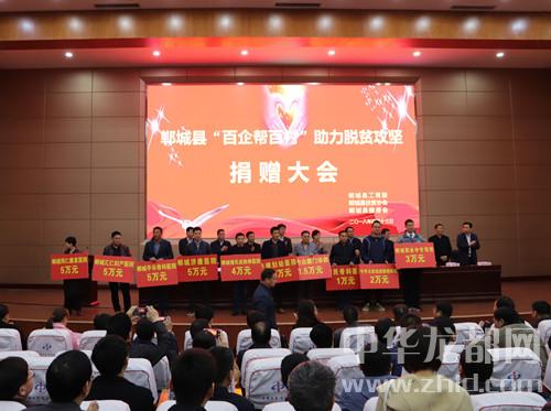 中華龍都網(wǎng)訊(周口報(bào)業(yè)全媒體記者 徐松 文/圖)4月13日,鄲城縣召開(kāi)“百企幫百村”助力脫貧攻堅(jiān)捐贈(zèng)大會(huì),全縣129家企業(yè)反哺社會(huì)助力脫貧攻堅(jiān),現(xiàn)場(chǎng)捐贈(zèng)近1300萬(wàn)元。鄲城縣四個(gè)班子領(lǐng)導(dǎo)、部分縣處級(jí)領(lǐng)導(dǎo)干部、縣慈善會(huì)會(huì)長(zhǎng)、縣扶貧協(xié)會(huì)會(huì)長(zhǎng)、縣直各單位和鄉(xiāng)鎮(zhèn)負(fù)責(zé)人等參加捐贈(zèng)大會(huì)。縣委書(shū)記羅文閣發(fā)表講話,縣長(zhǎng)李全林主持會(huì)議。
