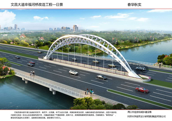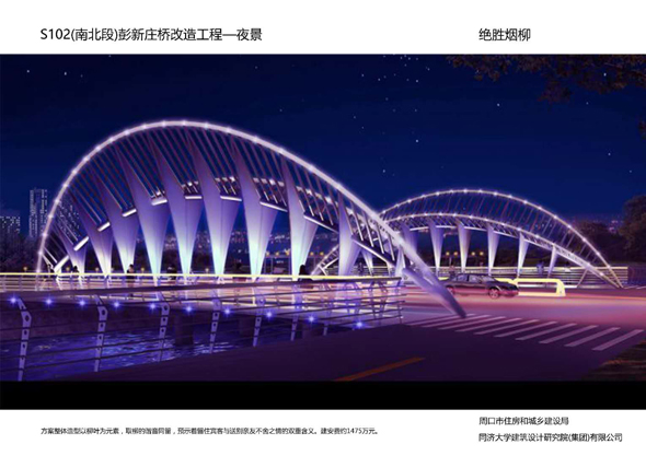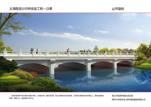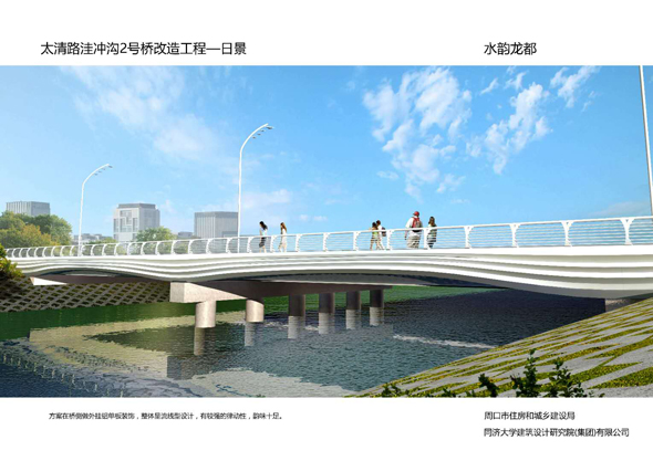 周口大道沙潁河橋景觀改造,設(shè)計(jì)造型簡單柔美,如行云流水,同時與沙潁河景觀帶相融合,給城市增添了生機(jī)與活力。周口大道賈東干渠橋以荷葉為設(shè)計(jì)元素,造型簡約而不失細(xì)節(jié)。周口大道流沙河橋造型簡潔大氣,線條流暢,像一條青龍游弋在水面上。文昌大道幸福河橋以花瓣、葉子為設(shè)計(jì)元素,造型豐富多彩。文昌大道流沙河故道橋在中分帶位置修建花壇,花壇造型莊重古樸,景石造型端莊沉穩(wěn)。太清路流沙河橋以古建斗拱、窗花為元素,造型儒雅大方。太清路洼沖溝2號橋以“輻轂相依”為名,既融合環(huán)境,又有團(tuán)結(jié)、合作的寓意。太清路賈魯河橋,增加了景觀造型,使人們可以重溫當(dāng)年賈魯河的美好畫卷。彭新莊橋以柳葉為元素,預(yù)示著留住賓客與送別親友的不舍之情的雙重含義。