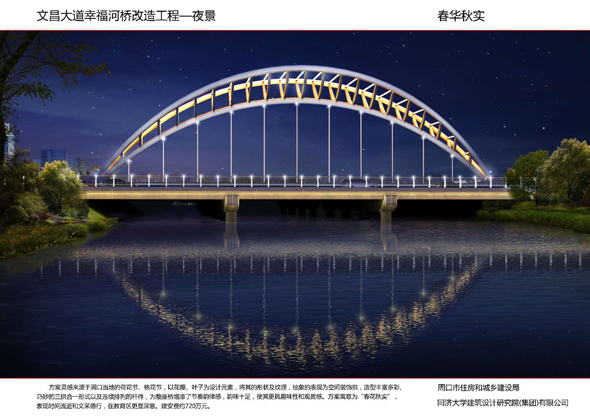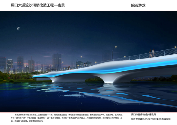 中原路跨沙潁河大橋,橋型采用下承式組合拱橋,遠(yuǎn)看像一輪新月,展現(xiàn)出了“一輪明月照古城”的美景。洼沖溝政通路橋以”振翅高飛的翅膀“為造型元素,在新建人行道橋內(nèi)側(cè)采用鋼結(jié)構(gòu)塑造翅膀造型,同時對人行橋營造出廊道的意境。洼沖溝人和路橋以“太極魚”為設(shè)計(jì)元素,體現(xiàn)“天人合一”。流沙河騰飛路橋拱圈外傾,形似一只翩翩起舞的蝴蝶。流沙河大成路橋兼具現(xiàn)代鋼橋和傳統(tǒng)拱橋的美感,充分體現(xiàn)周口厚重的歷史文化。