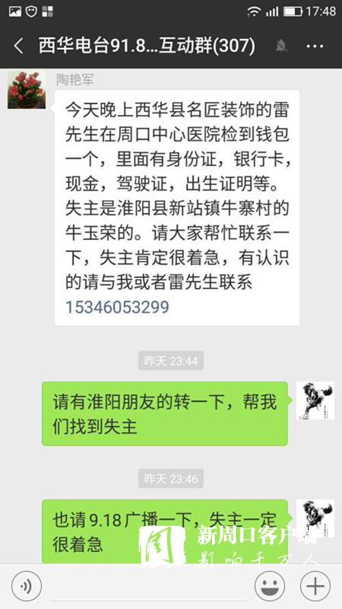 很快,一條尋找失主的愛心信息,便通過無(wú)線網(wǎng)絡(luò),乘著夜色翅膀,在豫東大地的西華縣政協(xié)群、西華縣非公黨工委群、西華縣城市管理群、西華縣愛心粥屋群、西華電臺(tái)91.8互動(dòng)群、周口市個(gè)私協(xié)會(huì)系統(tǒng)群、淮陽(yáng)縣非公黨工委群、淮陽(yáng)縣文明辦群、淮陽(yáng)縣城市管理群等微信群迅速散發(fā)開來(lái)。很多群友進(jìn)行轉(zhuǎn)發(fā)、點(diǎn)贊。