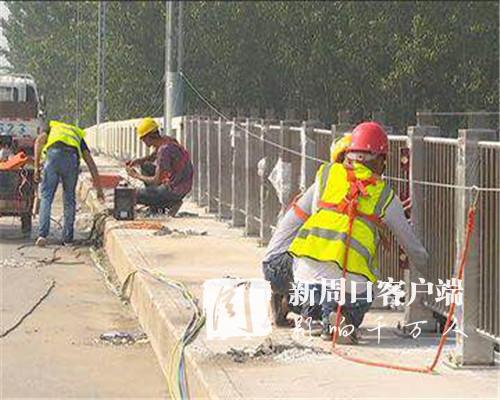 近日,記者在周口大道沙潁河大 橋施工現(xiàn)場看到,頂著37度高溫,施工人員正在進(jìn)行新欄桿的更換等工作。據(jù)工程施工方河南省大成建設(shè)工程有限公司項目商務(wù)經(jīng)理李寶胤介紹,大橋改造將在橋梁兩側(cè)各加寬九米,加上拱形鋼結(jié)構(gòu)造型?!澳壳耙巡鸪伺f欄桿,安裝上新的不銹鋼欄桿,在橋面人行道上鋪裝了石材,并對橋欄桿兩側(cè)及橋體兩側(cè)實施亮化工程,預(yù)計8月底前完工,而后再陸續(xù)進(jìn)行橋梁加寬工程。”