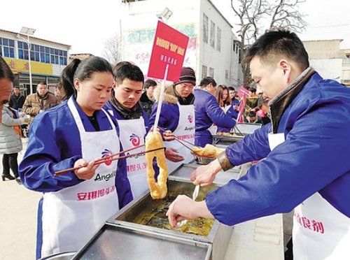 為了讓更多的人利用炸油條走上致富路,鄧城鎮(zhèn)從2012年開始,每年定期舉辦炸油條大賽,或者是技能培訓,請到一些炸油條的大師或者面點專家,免費提供技能培訓,給想學炸油條的人搭建一個平臺。這個活動也成了當?shù)刈顬槭⒋蟮拿朗彻?jié)。目前,炸油條大賽已經(jīng)舉辦了6屆,參加的人數(shù)不斷增加,比賽的代表隊從剛開始的十幾個增加到30個。