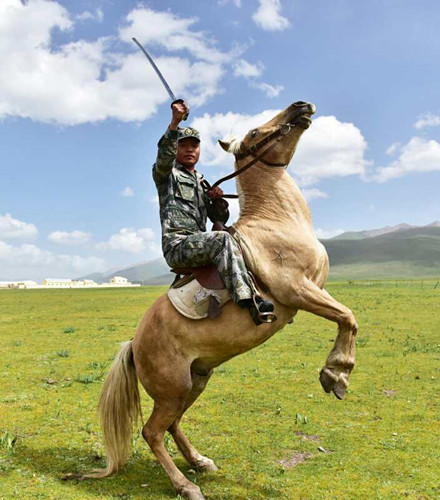 盛夏的巴塘草原,天藍(lán)草綠,戰(zhàn)馬嘶鳴。不遠(yuǎn)處的開闊地上,豎著7個高低不同的靶標(biāo)。隨著連長王育龍一聲令下,駕著“頭馬”的上士趙雪超高聲長嘯揚鞭策馬疾馳,他利落地拔出馬刀,左刺右劈,刀起靶落,一整套動作一氣呵成,彪悍十足。近距離觀摩課目示范的騎兵連新兵一個個驚呼“開了眼”,都說從趙班長身上看到了影視劇里蒙古鐵騎的影子。