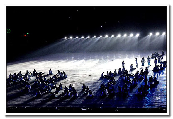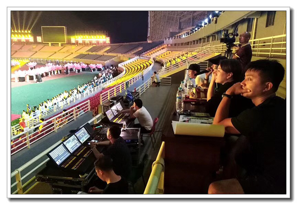 省運(yùn)會(huì)開(kāi)幕式第二篇章《幸福家園》,昨晚八點(diǎn)在周口體育場(chǎng)對(duì)光排練,直至凌晨?jī)牲c(diǎn)結(jié)束。葛英 攝