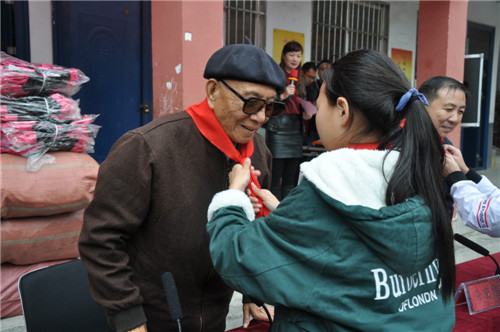 瑟瑟寒風抵擋不住火熱愛心,毛毛細雨阻擋不了赤子情懷。愛心助學(xué)現(xiàn)場,于學(xué)龍不顧高齡,除了給孩子們送去愛心禮物之外,還站在雨中分享了自己的成長經(jīng)歷,教育孩子們要學(xué)會刻苦、學(xué)會拼搏,還要懂得感恩和奉獻。