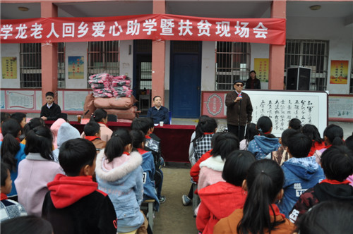 雖然身在北京,但于學(xué)龍老人的心始終牽掛著故鄉(xiāng)。11月5日,他回到老家商水縣黃寨鎮(zhèn),用自己的退休金,為母校埠口小學(xué)的孩子送來一批嶄新的書包和自己創(chuàng)作的書法精品?!坝H愛的小校友們,你們背上書包上學(xué)就更方便了,希望你們好好學(xué)習、茁壯成長,將來成為社會棟梁,報效國家。”于學(xué)龍對孩子們說。