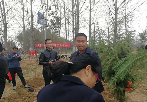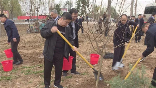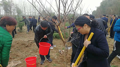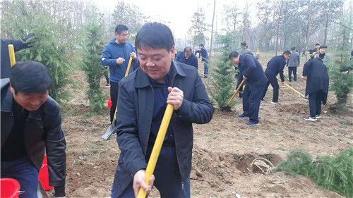 當天下午雖然暖陽照射,但初冬的鹿邑大地仍是涼風習(xí)習(xí)。不過這一點兒也沒有影響到大家的心情。一到植樹現(xiàn)場,梁建松、李剛等領(lǐng)導(dǎo)就和大家一起興致勃勃地拿起鐵鍬等工具忙碌起來,揮鍬鏟土,扶樹填土,澆水正苗,每道工序都做得認真細致、一絲不茍。