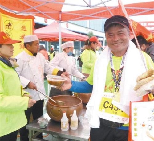 提起周口,“周口胡辣湯”可謂聲名在外。此次馬拉松賽事,主辦方為了讓選手品嘗到周口香辣可口的胡辣湯,特意將周口4家不同口味的胡辣湯“端”到比賽現(xiàn)場(chǎng),讓很多跑友過(guò)了一把胡辣湯癮。圖為參賽選手品嘗胡辣湯。記者 張志新 攝