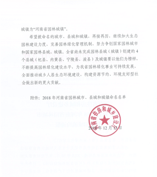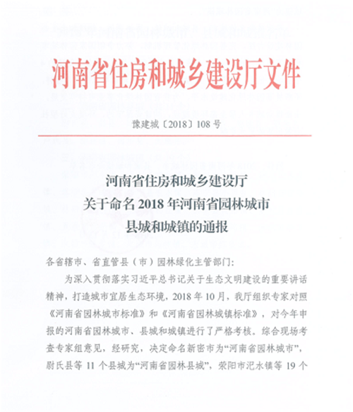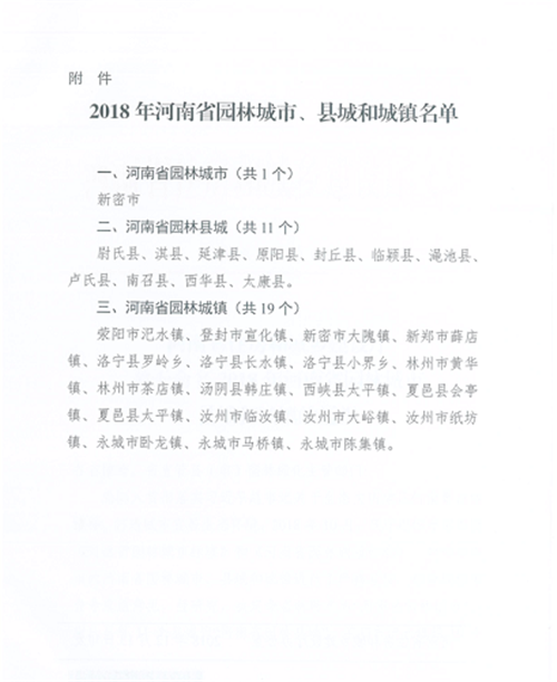 其中,新密市1地被命名為河南省園林城市,太康縣、西華縣、尉氏、淇縣、延津縣、原陽縣等11個(gè)縣被命名為河南省園林城市,登封市宜化鎮(zhèn)、新密市大隗鎮(zhèn)、新鄭市薛店鎮(zhèn)等19個(gè)鄉(xiāng)鎮(zhèn)被評(píng)為河南省園林城鎮(zhèn)。