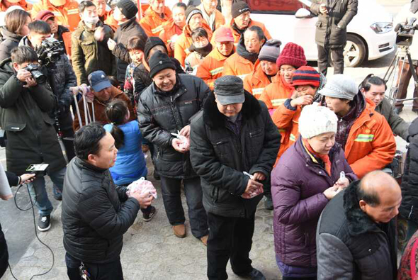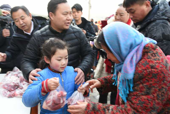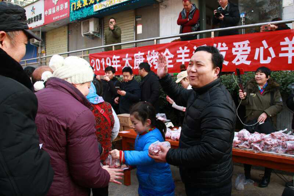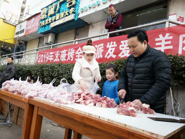 小小燒烤店門(mén)前,成了倡導(dǎo)“愛(ài)與奉獻(xiàn)主會(huì)場(chǎng)”。 2019年1月1日上午10點(diǎn),新年第一天,鄭州市國(guó)基路與豐慶路交叉口太康烤全羊店門(mén)口,60多名環(huán)衛(wèi)工、殘疾人、困難群眾等弱勢(shì)群體聚集在這里,排隊(duì)免費(fèi)領(lǐng)取“羊肉哥”孫合理和妻子劉曉愛(ài)派送的一份新年禮物——愛(ài)心羊肉,而這愛(ài)舉從2010年元旦開(kāi)始到如今,已經(jīng)堅(jiān)持了9年。