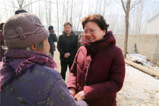 2018年5月11日,張穎波在看望大新鎮(zhèn)陳樓村的困難群眾吳鳳蓮時,曾對她說過一句話,“等你新房蓋好,我再來看你?!保罚稓q的吳鳳蓮把這句話牢牢地記在了心里。一見張穎波的面,拉著手留著淚連聲說:“俺家房早就蓋好了,就一直盼著恁來。我知道恁忙,可就想讓恁看看俺的房……”老人和一位患病的兒子一起生活,去年5月份張穎波來時,她家正因“危房清零”活動而扒掉舊房蓋新房。張穎波當時還特意滿足了老人的一個愿望,安排村干部為她家房內專門壘個隔斷?!拔遥罚岸嗔耍瑥膩頉]住過這么好的房、從來沒過過這么好的日子!”新建的三間磚瓦房、一間配套齊全的廚房和壘好的院墻讓老人感慨不已,發(fā)自肺腑地說著黨和政府的好?!袄先思?,我今天就是想看看房子改造的怎樣,也給你拜個早年?!睆埛f波拉著吳鳳蓮老人的手說:“房子蓋好了,也算了了你的一個心愿,有黨和政府的幫助,日子會越來越好。你要照顧好自己和孩子,有啥困難就找村里干部?!?/p>
