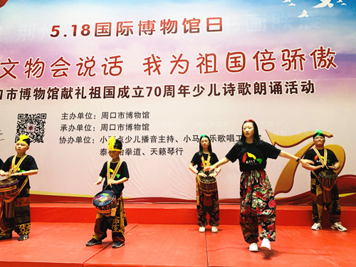 5月18日國際博物館日當天,周口市博物館舉行系列主題活動“如果文物會說話,我為祖國倍驕傲”詩歌朗誦活動、文物繪畫作品展活動。在活動現(xiàn)場,小朋友們帶來了精彩紛呈的節(jié)目,有根據市博物館的文物創(chuàng)作的詩歌作品《文物會說話:漢代玉豬》《文物會說話:戰(zhàn)國青龍玉佩》,有集體朗誦《中華頌》《初生的太陽》《我驕傲我是中國人》,還有獨唱、舞蹈、相聲、跆拳道、非洲鼓表演等,共同為本次活動增光添彩。