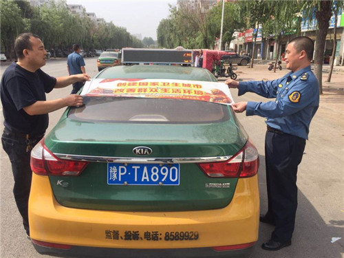 由區(qū)五城聯(lián)創(chuàng)指揮部牽頭,組織區(qū)城管局、區(qū)交通運(yùn)輸局等職能部門,利用城管執(zhí)法車輛、環(huán)衛(wèi)保潔車輛、交通執(zhí)法車等,統(tǒng)一張貼宣傳標(biāo)語進(jìn)行宣傳。日出動(dòng)各類宣傳車輛109輛。區(qū)五城聯(lián)創(chuàng)指揮部辦公室會(huì)同區(qū)交通運(yùn)輸局在中心城區(qū)出租車上統(tǒng)一張貼創(chuàng)衛(wèi)宣傳標(biāo)語和禁煙標(biāo)志,累計(jì)張貼出租車600余輛。多種載體宣傳。利用車體標(biāo)語、車載音響、大喇叭、出租車頂燈等載體,大密度宣傳創(chuàng)衛(wèi)標(biāo)語口號(hào),播放統(tǒng)一灌制的創(chuàng)衛(wèi)宣傳音頻。