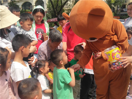 活動中,工作人員精心穿著卡通人偶服裝與小朋友們熱情互動、做游戲,天氣雖然炎熱,但孩子們卻忙的不亦樂乎,家長們喜笑顏開,一派祥和、歡樂的氣氛。
